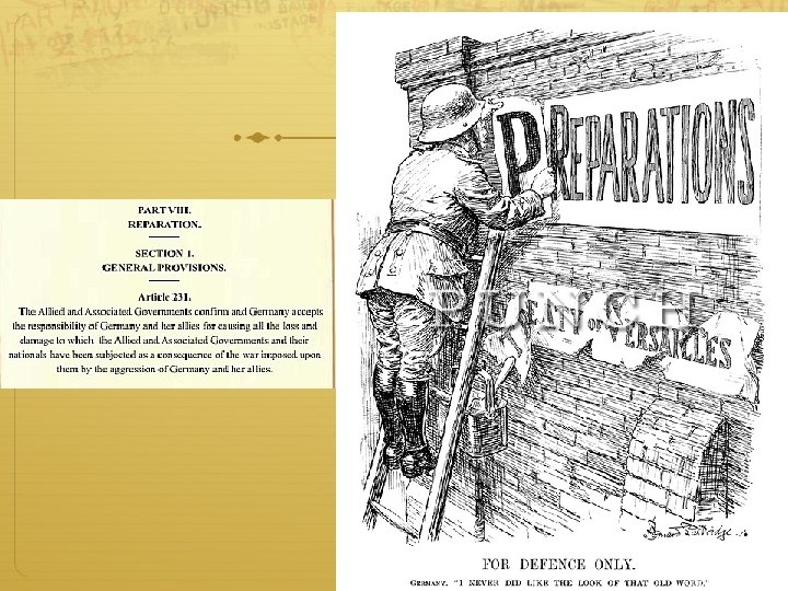Treaty of Versailles 11 th hour of the 11 th day of the 11 th month = armistice “Big Four” meet in Versailles Georges Clemenceau (FR), David Lloyd George (GB), W. Wilson (US), and Vittorio Orlando (IT) German reparations were immense and GM was not allowed to participate (servants’ quarters)