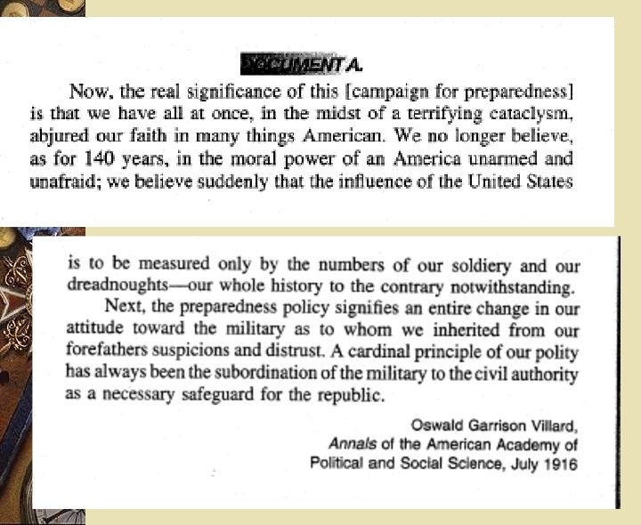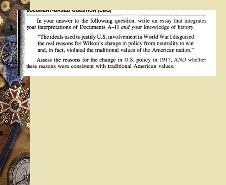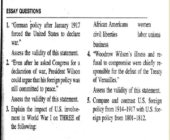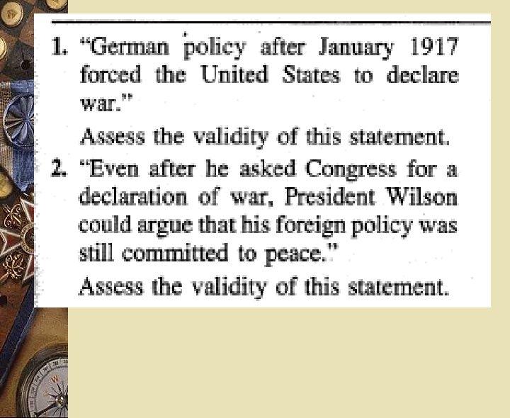 From 1995 w Assess the relative influence of THREE of the following in the American decision to declare war on Germany in 1917. w German naval policy w American economic interests w Woodrow Wilson’s idealism w Allied Propaganda w America’s claim to world power