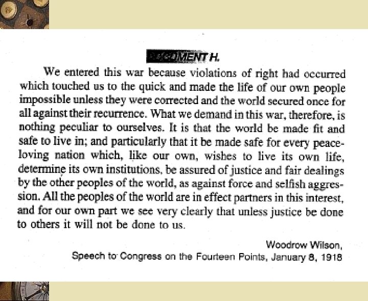 Wilson’s Fourteen Points of Peace 1. open diplomacy 2. freedom of the seas 3. free trade 4. arms reduction 5. self-determination 6 -13. change of Europe’s boundaries 14. League of Nationsbody of collective security Goal: To make the Great War “the war to end all wars”