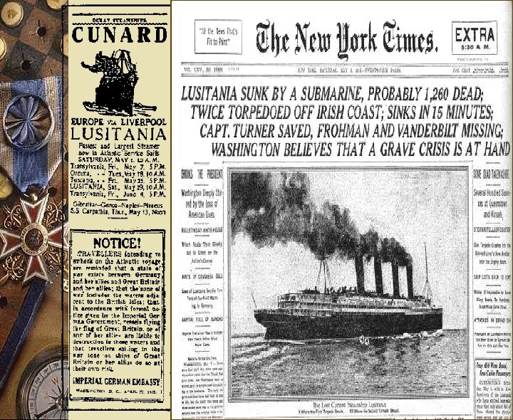 Lusitania w British passenger liner, was sunk off coast of Ireland on May 7, 1915 w 1, 198 lives lost including 128 Americans w carrying 4, 200 cases of small-arms ammunition, a fact that the Germans used for sinking the ship w Germany refused to apologize; Uboat commander glorified in Germany. w Significance: American public opinion turned against Germany; perhaps beginning of U. S. road to entry into the war w In response, Wilson attempted to sternly warn Germans against further aggression Only 6/48 Lifeboats lowered