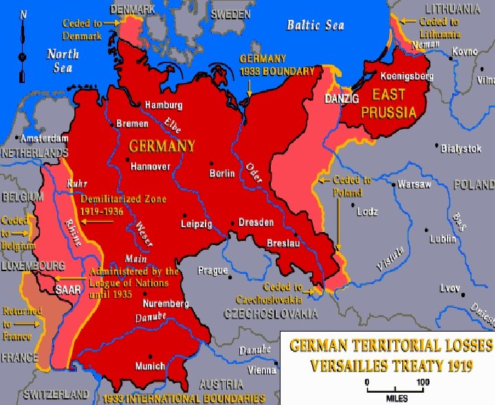 Treaty of Versailles w Germany had to accept the blame for starting the war w Germany had to pay $33 billion in reparations w Germany was forbidden to have submarines or an air force w Germany lost Territory w Germans felt betrayed, surrendered under the pretense of the 14 Points w PUNISHED GERMANY
