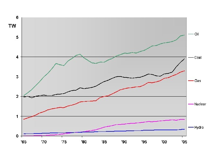 Energy Consumption Breakdown Fuel type Power (TW) Energy (1018 J/yr) % Oil 5. 6 180 38 Gas 3. 5 110 24 Coal 3. 8 120 26 Hydroelectric 0. 9 30 6 Nuclear 0. 9 30 6 0. 13 4 0. 9 14. 83 474 100 Geo, wind, solar, wood Total