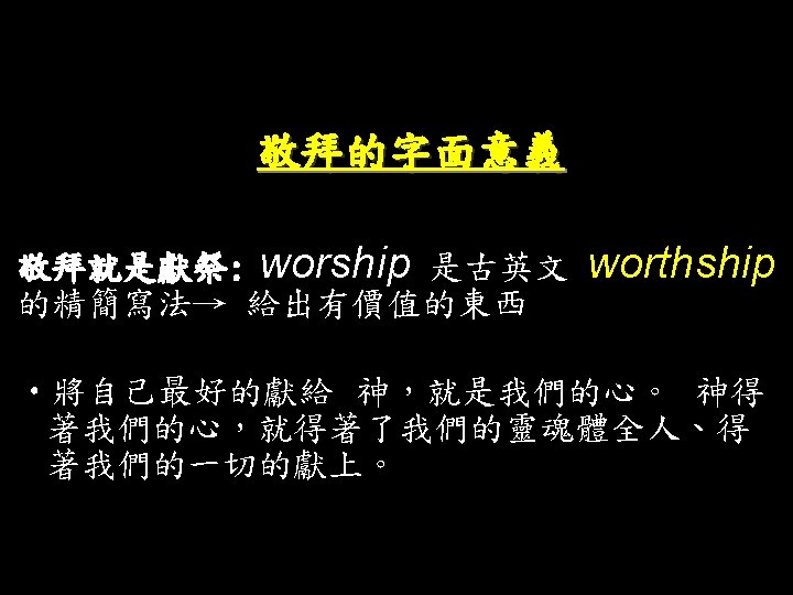 Worship involves offering to God all that we are and all that we'll be – offering our heart, soul, and mind. 羅馬書 Romans 12: 1 Therefore I urge you brothers, in view of God's mercy, to offer your bodies as living sacrifices, holy and pleasing to God – this is your spiritual act of worship.