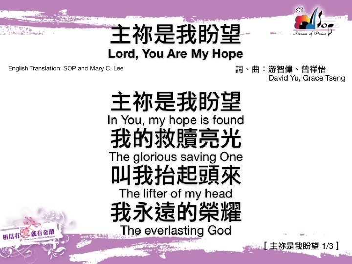 You are the peace that guards my heart 你是我心中的平安 My help in time of need 我隨時的幫助 You are the hope that leads me on 你是我永恆的盼望 And brings me to my knees 我屈膝敬拜你