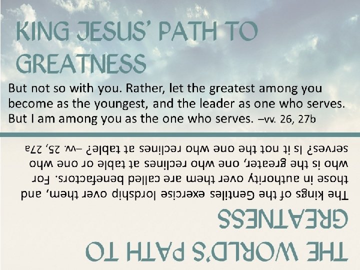 THE WORLD’S PATH TO GREATNESS The kings of the Gentiles exercise lordship over them, and those in authority over them are called benefactors. For who is the greater, one who reclines at table or one who serves? Is it not the one who reclines at table? –vv. 25, 27 a But not so with you. Rather, let the greatest among you become as the youngest, and the leader as one who serves. But I am among you as the one who serves. –vv. 26, 27 b KING JESUS’ PATH TO GREATNESS