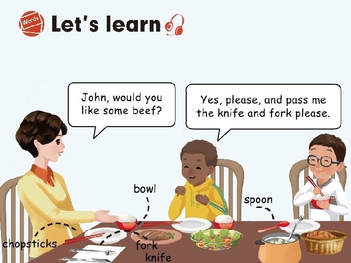 spoon 4. Use the ______. fork 5. Use the _____. 6. Now let's try it. 让我们来品尝一下吧!