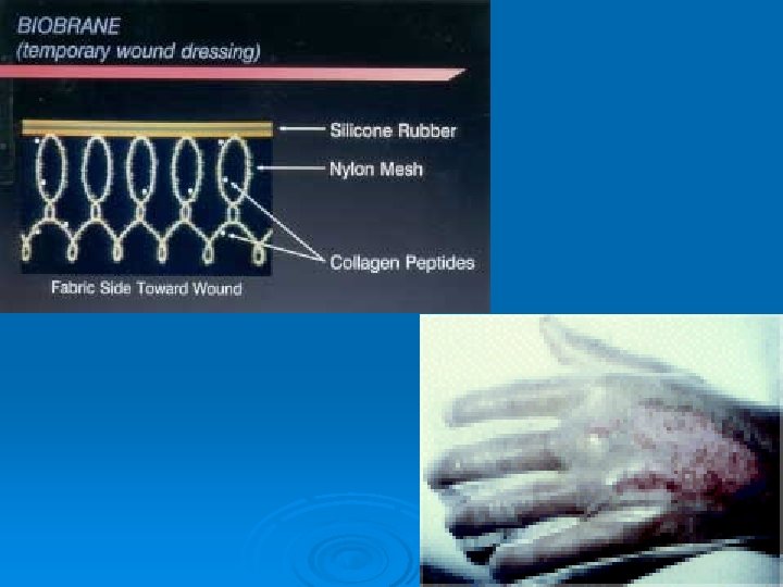 Biobrane Ø Ø Ø 1979 collagen-coated silicon in a sheet adherent in 24 -48 hours a barrier of moisture loss relative painless wound not require change dressing Ø Ø impermeable to bacteria complicated by exudate accumulation risking invasive wound infection