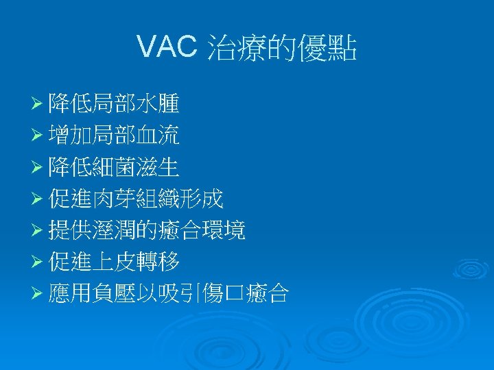 Principal indications for the use of the mains powered VAC Ø Acute and traumatic wounds Ø Subacute wounds (i. e. dehisced incisions) Ø Pressure ulcers Ø Chronic open wounds (stasis ulcers and diabetic ulcers) Ø Meshed grafts Ø Flaps