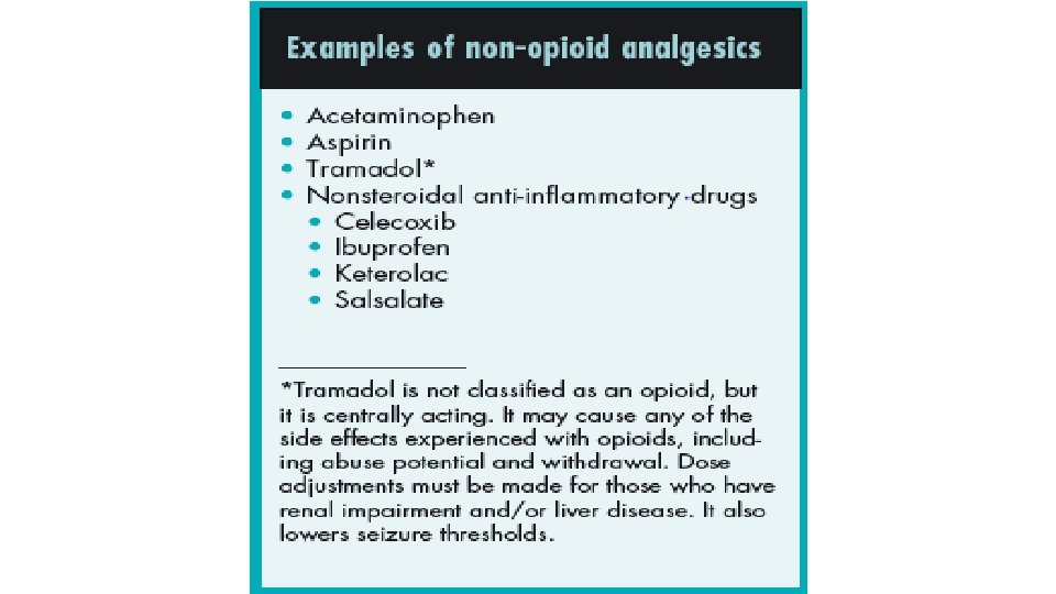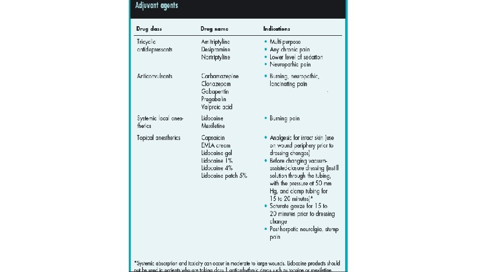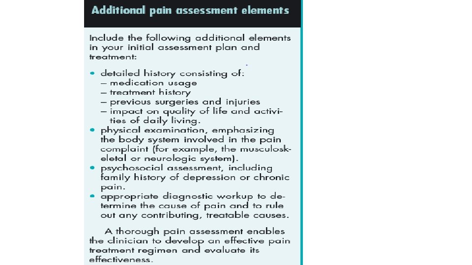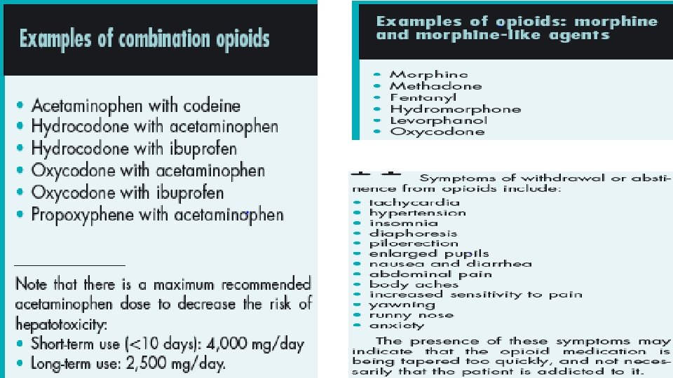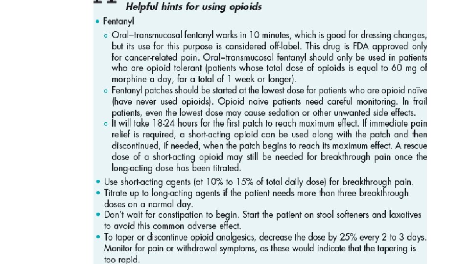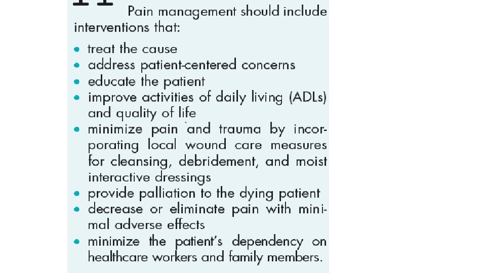 Alternative pain management methods • Many natural pain control methods and therapies may be implemented to ease pain, stress, and anxiety. These methods can improve one’s outlook, attitude, and quality of life. • Alternative therapies, when used in conjunction with pain medications, may enhance the beneficial effects of pain medication. • Laughter helps you breathe • deeper, lowers your blood pressure, and changes your mood. • Acupuncture. The application of needles • to specifi c areas of the body may decrease or eliminate pain and has been used for more than 2, 500 years.