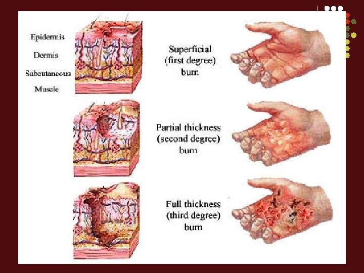 BURNS l Burns are classified by their sources: l l Heat, chemicals, electricity, radiation Also classified by depth: l Deeper the burn, worse it is. l l l Superficial (1 st Degree) Partial Thickness (2 nd Degree) Full Thickness (3 rd Degree)