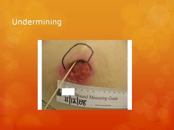 Undermining • Indicate disease process • Need for ‘hidden area debridement’ • Indicates no healing of tissues due to lack of healing potential • More complicated process