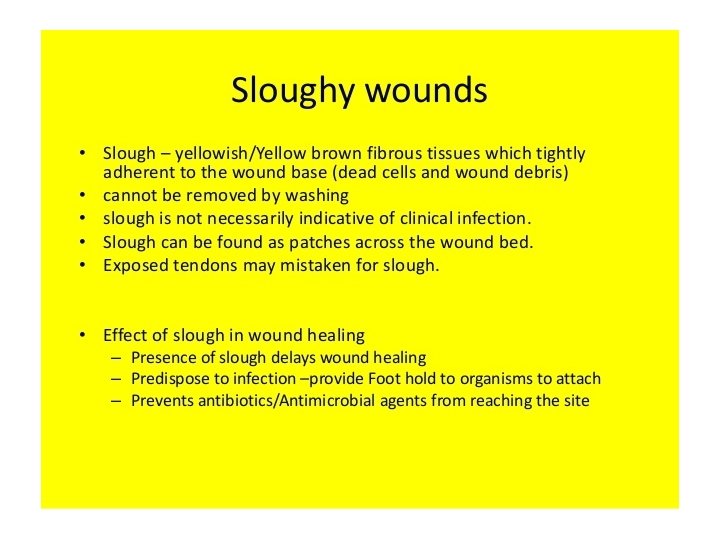 Shallow slough versus deep, adherent slough When deep it probably needs surgical debridement