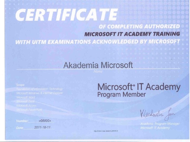Certyfikat Microsoft IT Academy WSIi. Z jest od lat autoryzowanym akademickim ośrodkiem szkoleniowym firmy MICROSOFT w ramach programu „Microsoft IT Academy” Uczestnictwo w tym programie umożliwia uzyskanie certyfikatów Microsoft honorowanych na całym świecie www. microsoft. com/itacademy