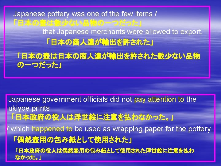 Lesson 10 Van Gogh and Ukiyoe Japanese pottery was one of the few items / that Japanese merchants were allowed to export. Japanese government officials did not pay attention to the ukiyoe prints / which happened to be used as wrapping paper for the pottery. In this way, thousands of ukiyoe prints were able to make their way to European countries. From the middle of the 19 th century, the influence of Japan on Western art, called Japonisme, enchanted Europeans. And many artists tried to create works with an exotic Japanese touch. At the Paris World Exhibition of 1867, the large number of ukiyoe prints on display charmed such French artists as Degas, Monet, and Manet.