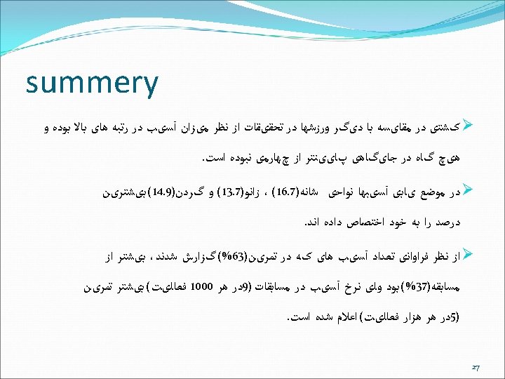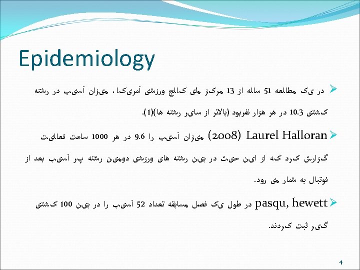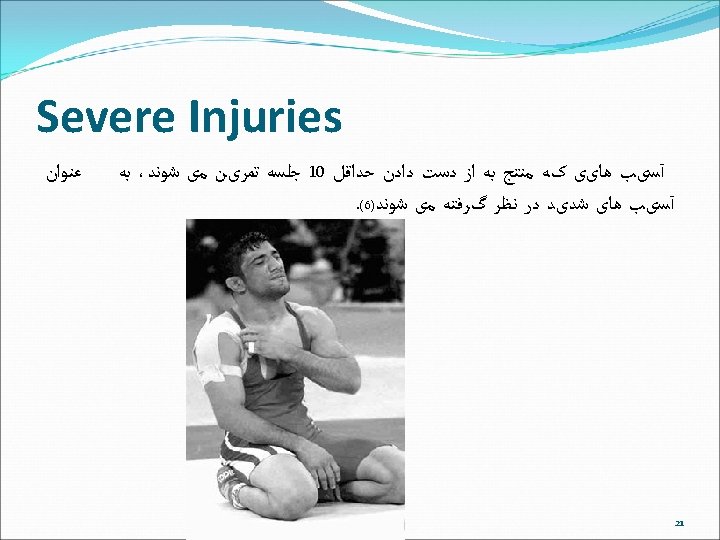 1. Neurological surgery. Julion R. , Youman. 4 th edition, WB. Saunders, philadelphia, 1998, 2241 - 2243. 2. Laurel Halloran(2008)، Wrestling Injuries، Orthopedic Nursing; May/Jun 2008; 27, 3; Health Module pg. 189 3. Timothy E. Hewetta, b, Charles Pasquec, Rachel Heyla, Randy Wrobled. Caine (2005)، Wrestling Injuries DJ, Maffulli N (eds): Epidemiology of Pediatric Sports Injuries. Individual Sports. Med Sport Sci. Basel, Karger, 2005, vol 48, pp 152– 178 4. Yard et al , An epidemiologic comparsion of high scool and college wrestling injuries, American journal of sports medicine, 56 -54, 2007 29