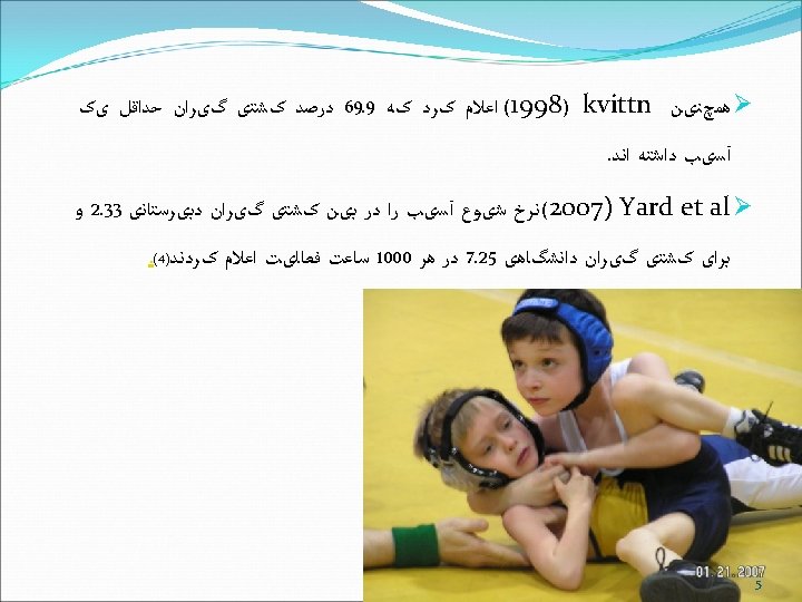 5. Charles B. Pasque and Timothy E. Hewett. Am. J. Sports Med. 2000; 28; 509. A Prospective Study of High School Wrestling Injuries 6. Julie Agel, MA, ATC*; Jack Ransone, Ph. D, ATC, FACSMt; Randall Dick, MS, FACSM*; Robert Oppliger, Ph. D, FACSM§; Stephen W. Marshall, Ph. D|| Descriptive Epidemiology of Collegiate Men‘s Wrestling Injuries: ational Collegiate Athletic Association Injury Surveillance System, 1988 -1989 Through 2003 -2004. 7. Glenn J. Jarrett, * MD, John F. Orwin, *† MD, and Randall W. Dick, ‡ MS. Injuries in Collegiate Wrestling. THE AMERICAN JOURNAL OF SPORTS MEDICINE, Vol. 26, No. 5 © 1998 American Orthopaedic Society for Sports Medicine 8. E. E. Yard 1, R. D. Comstock. A comparison of pediatric freestyle and Greco-Roman wrestling injuries sustained during a 2006 US national tournament. Scand J Med Sci Sports( 2008) 30