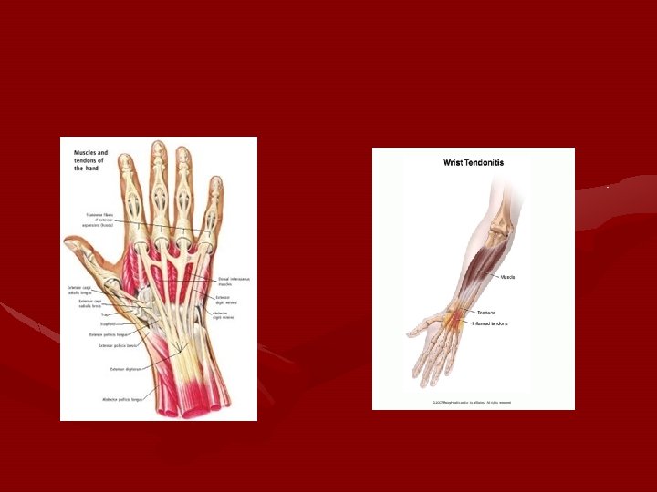 Wrist Tendonitis • MXN: repetitive motion at wrist—usually in flexion/extension – Seen more often in athletes involved ins sports with repetitive acceleration and deceleration • i. e. weight lifters, rowers