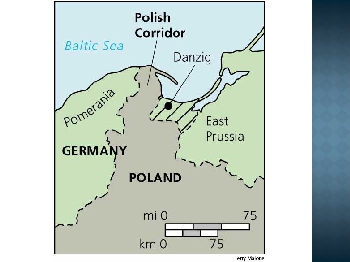 The outcomes of the Treaty of Versailles continued: Danzig Poland (Poland) becomes a free city. gets access to the sea (Polish Corridor) + part of Prussia.