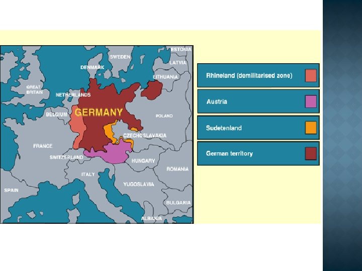 The main points the Germans objected to in the Treaty of Versailles were (continued): The loss of territory (German land was taken away) – no anschluss (Germany forbidden to unify with Austria). Disarmament – limits set to the size of the German army and navy and total restrictions on troops in the Rhineland, on the production of tanks, armoured vehicles, aircraft and submarines.