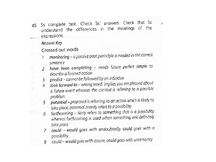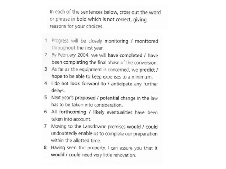 STYLE: Future & Hypothetical constructions • Certain verbs also suggest the future. – These include propose, intend, expect, hope, predict, forecast, look forward to, anticipate, etc. • E. g. We predict a profit in the first year of over $2, 000. • E. g. As we do not anticipate any further problems, the society hopes to hold the first meeting next month. • Some adjectives can also be used with a future meaning. – These include imminent, potential, probable, possible, forthcoming, future, expected, proposed, etc. • E. g. the proposed change of use, the potential danger, future discussion, etc. • In addition to the above, hypothetical constructions can be used to write about things that are not certain. – E. g. This would mean that, if we could manage to, this should, etc.