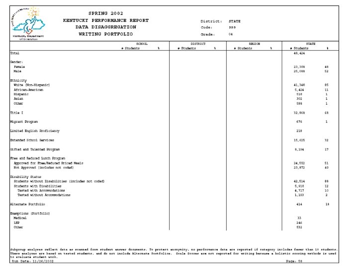 Challenge 2: Reading a series of figures. 1. What do these visuals show? 2. What conclusions/trends can be drawn from these visuals? 3. How do these visuals relate to each other? Do they support each other, contradict each other, or …. ? 4. What other data might you want to see in addition to these? Kentucky Department of Education. (2003). Kentucky Performance Report. [WWW Document] URL http: //app 1. kde. state. ky. us/secure_cats_reports_03/index. cfm? action=display_regionstate (visited 2004, Jan 4).
