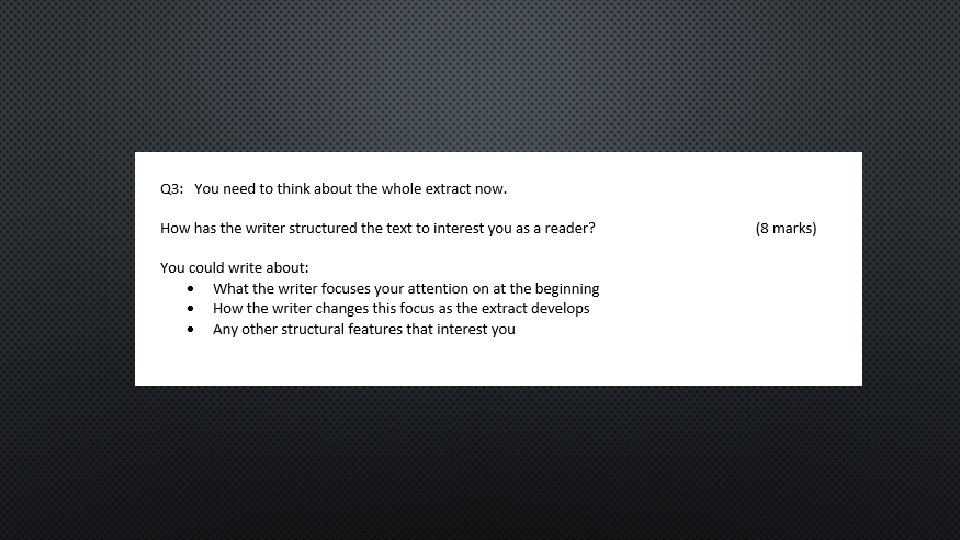 WHAT THE WRITER FOCUSES YOUR ATTENTION ON AT THE BEGINNING. • THE FIRST BULLET POINTS WANTS YOU TO ANALYSE THE FIRST PARAGRAPH. • WHAT HAPPENS WHERE? • DOES THE PARAGRAPH ESTABLISH SETTING, TIME, PLACE OR CHARACTER? • IS IT INSIDE OR OUTSIDE? • ARE FEELINGS EXPLORED? • DOES THE TOPIC CHANGE? • DOES THE WRITER CREATE TENSION? • WHAT DOES THE WRITER DO TO MAKE YOU WANT TO READ ON?