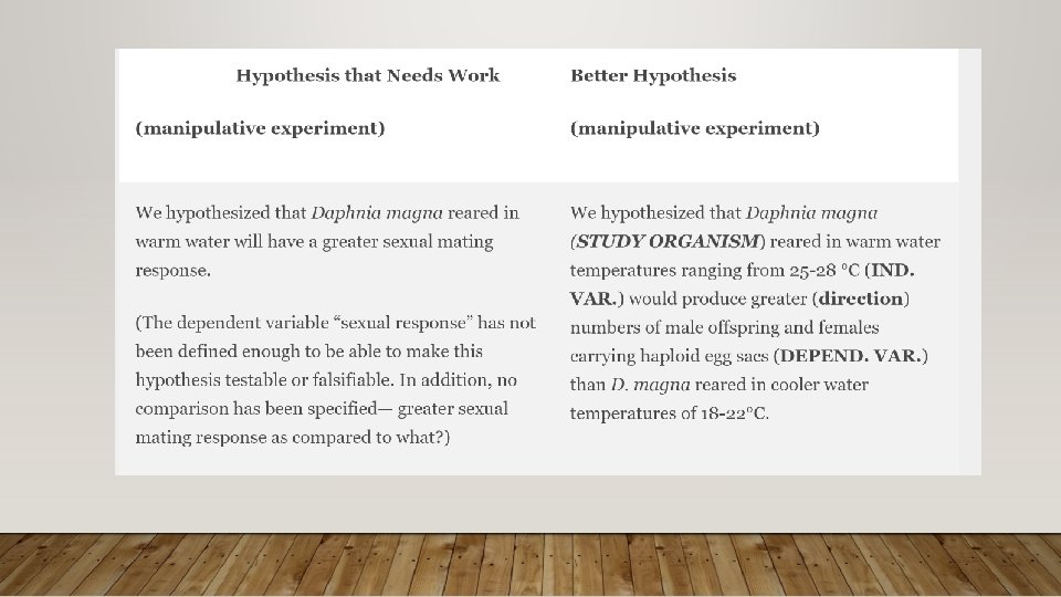 HOW TO CONSTRUCT A SOLID INTRODUCTION TO A SCIENTIFIC PAPER • Hypothesis / Predictions: specific prediction(s) that you will test during your experiment. • For manipulative experiments, the hypothesis should include the independent variable (what you manipulate), the dependent variable(s) (what you measure), the organism or system, the direction of your results, and comparison to be made.