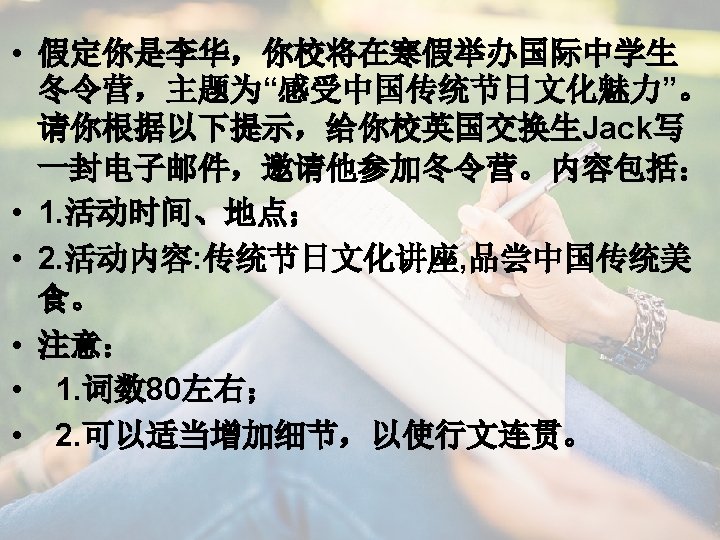 Dear Frank, A. We are having a New Year Party next Monday, so I'm writing this letter to invite you to attend it. B. We are going to have a New Year Party next Monday, so I'm writing this letter to invite you to attend it. C. We are going to have a New Year Party the next Monday, so I'm writing this letter to invite you to attend it. Tip 1: Tense时态-- future tense will, be to, be going to, be scheduled to. . .