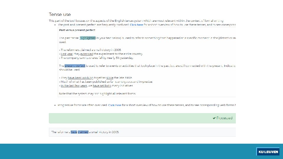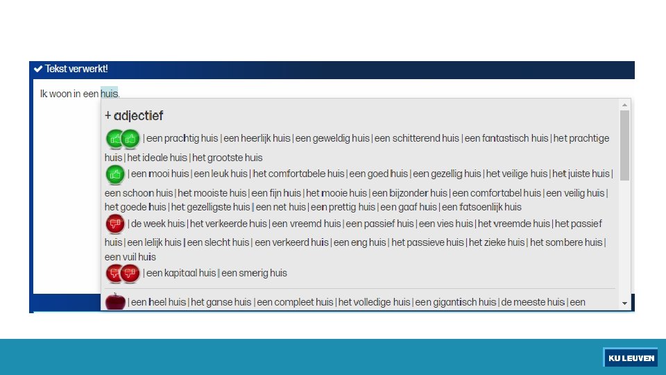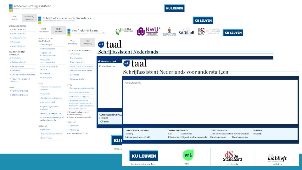 Performance? • state-of-the-art for some features: • spell checker for Dutch (2017) non-word errors /100 Valkuil. net 31 Klinkende Taal 88 Word 91 Spelcheck. nl 97 Google Chrome 97 Writing assistant Dutch 100 Language. Tool. org 100 = Spelling. nu • specific language errors for English by native Dutch language speakers • close to state-of-the-art for other features • correction + detection + prediction