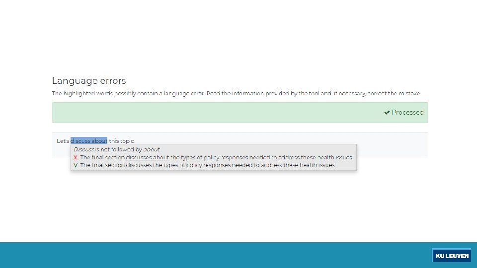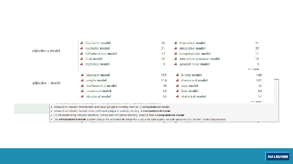 • Cut-off point? • p ≥ 0. 975 → >= 95% accuracy → ± 45% of tested sentences suggestion for correction + 5 sample sentences taken from a corpus • 0. 975 < p > 0. 85 → = 70% accuracy → ± 20% of tested sentences 5 sample sentences taken from corpus for both prepositions (original & suggested preposition) • p ≤ 0. 85 no suggestion made
