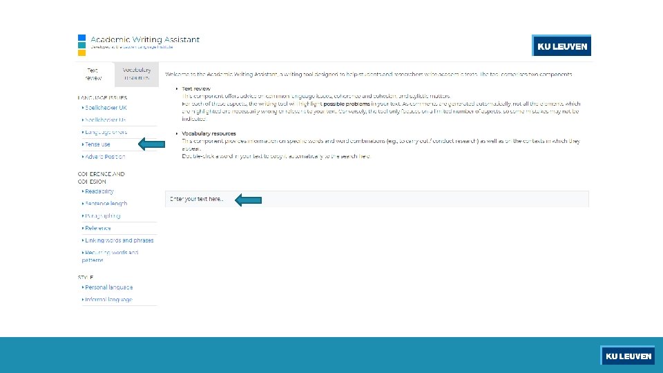 References Brants, Thorsten, and Alex Franz. 2006. Web 1 T 5 -gram Version 1 LDC 2006 T 13. DVD. Philadelphia: Linguistic Data Consortium. Flower, L. , Hayes, J. R. 1980. The dynamics of composing. In L. W. Gregg & E. R. Steinberg (eds. ) Cognitive Processes in Writing. Hillsdale, NJ: Lawrence Erlbaum Assoc. , Pub. Laufer, B. 1998. The Development of Passive and Active Vocabulary in a Second Language: Same or Different. Applied Linguistics 19. 2: 255 -271. Leacock, C. , Chodorow, M. , Gamon, M. and Tetreault, J. 2014. Automated grammatical error detection for language learners. Morgan. & Claypool. Mikolov, T. , Grave, E. , Bojanowski, P. , Puhrsch, C. , Joulin, A. 2018. Advances in pre-training distributed word representations. Proceedings of the International Conference on Language Resources and Evaluation (LREC 2018). Strobl, C. , Ailhaud, E. , Benetos, K. , Devitt, A. , Kruse, O. , Proske, A. and Rapp, C. 2019. Digital support for academic writing: A review of technologies and pedagogies. Computers & Education, 131: 33 -48. Tarp, S. , Fisker, K. and Sepstrup, P. 2017. L 2 writing assistants and context-aware dictionaries: New challenges to lexicography. Lexikos, 27: 494– 521. Ziyuan, Y. 2012. Breaking the language barrier : a game‐changing approach. (https: //sites. google. com/site/yaoziyuan/publications/books/breaking‐the‐language‐barrier‐a‐gamechanging‐approach) Dutch writing assistant: https: //schrijfassistent. be. The other writing assistants are licenced products. AWSu. M: http: //langtest. jp/awsum/; Collo. Caid: https: //www. collocaid. uk/; fast. ai: https: //www. fast. ai/; fast. Text: https: //fasttext. cc/; Flax: http: //flax. nzdl. org/greenstone 3/flax; Just-the-word: http: //www. just-the-word. com/; LEAD: https: //leaddico. uclouvain. be/login; Netspeak: http: //www. netspeak. org/; spa. Cy: https: //spacy. io/; Writeful: https: //writefullapp. com/