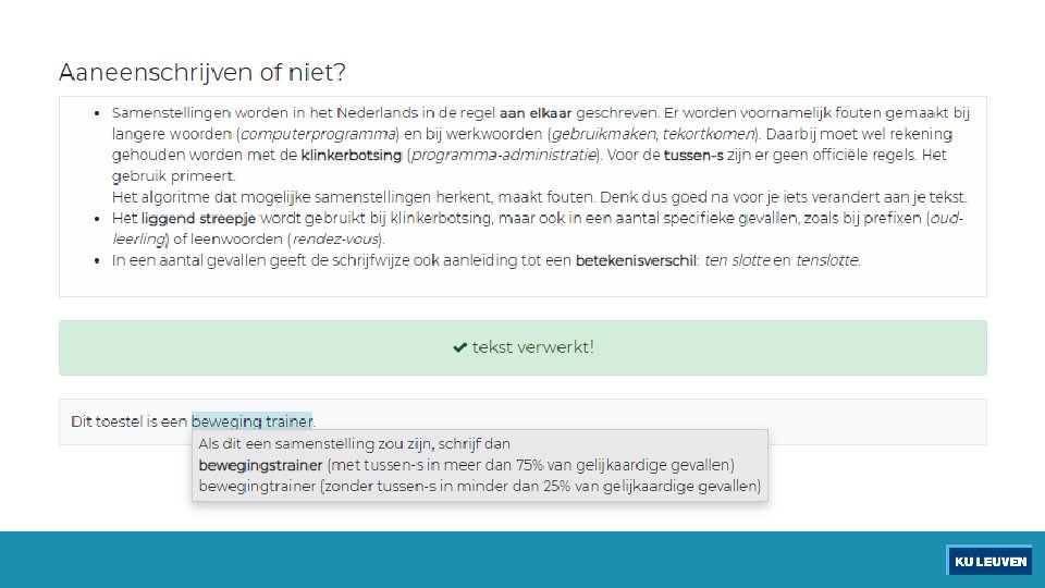 Spell checker • Rationale: • Goals: • Workflow: compounds: Dutch, German vs English avoiding false positives identifying potential compound errors + suggesting correct form (interfix -s-!) breaking down existing compounds > list of potential modifiers and heads > set of restriction rules