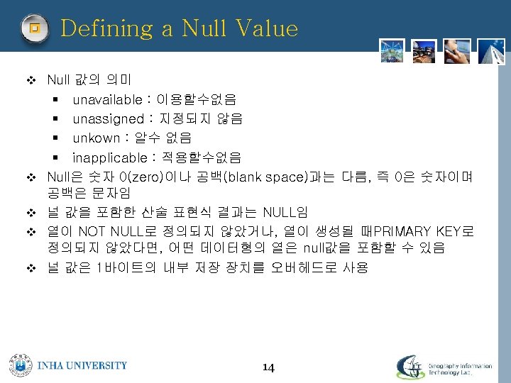 Operator Precedence(2/2) v 연산자 우선순위 § 연봉은 월 급여에 12를 곱하고, 보너스 $100를 더하여 산출 SELECT ename, sal, 12*sal+100 FROM emp; - 곱셈 : 9, 600 +100 = 9, 700 - 덧셈 : 12 *900 =10, 800 12