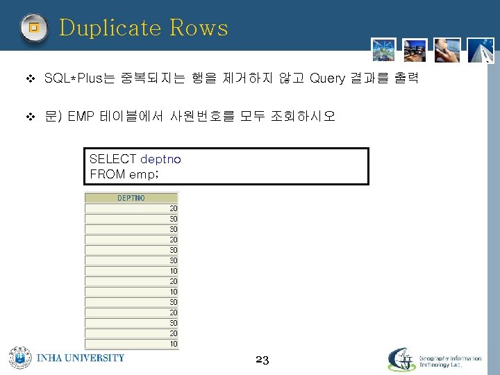 Using Literal Character Strings v 문) EMP에서 이름과 업무를 “KING is a PRESIDENT” 형식으로 출력 SELECT ename || ' ' || 'is a' || ' ' || job AS "Employees Details" FROM emp; 공백 공백 v 문) 이름과 연봉을 “KING: 1 Year salary = 60000” 형식으로 출력 SELECT ename || ': 1 Year salary = ' || sal * 12 Monthly FROM emp; 22