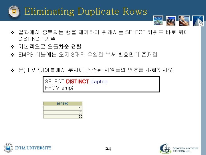 Eliminating Duplicate Rows v DISTINCT 키워드 뒤에 여러 개의 열의 조합이 중복되지않음 SELECT deptno, job FROM emp; v 문) EMP테이블에서 부서별 담당업무 조회하시오 SELECT DISTINCT deptno, job FROM emp; 25