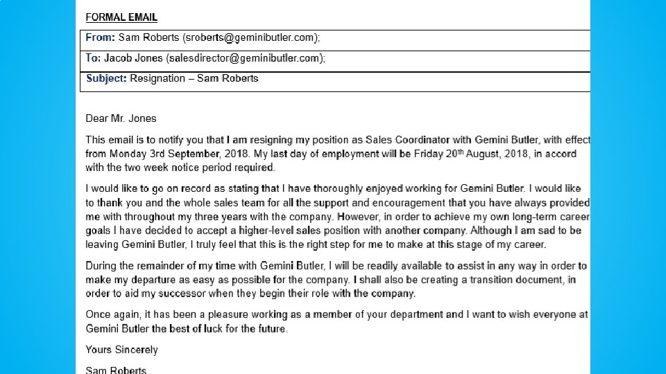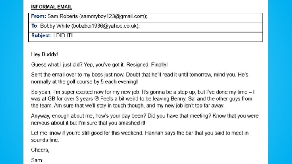 FINDING CONTENT AND LANGUAGE FEATURES You are now going to be shown one example of a formal email and one example of an informal email.