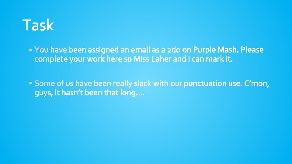 PLENARY ASSESSMENT Look at your email. Which award should you receive, and why? BRONZE AWARD SILVER AWARD GOLD AWARD - Shows some awareness of the correct structure of an email; - Has some awareness of audience and purpose; - Uses some of the language features appropriately; - Uses some of the content features appropriately. - Shows a clear awareness of the correct structure of an email; - Has a clear awareness of audience and purpose; - Uses a range of the language features clearly and appropriately; - Uses a range of the content features clearly and appropriately. - Shows creativity and precision in applying the correct structure of an email; - Points are elaborated on in detail, and are highly appropriate for audience and purpose; - Uses a range of the language features confidently, accurately and imaginatively; - Uses a range of the content features confidently, accurately and imaginatively.