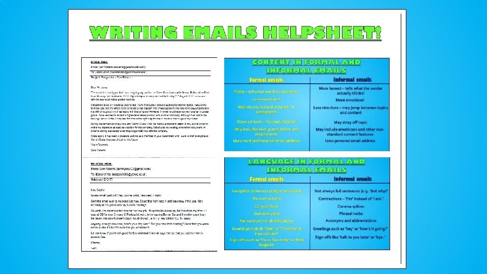 LANGUAGE IN FORMAL AND INFORMAL EMAILS Formal emails Informal emails Complete sentences (subject and verb) Not always full sentences (e. g. ‘But why? ’ No contractions Contractions – ‘I’m’ instead of ‘I am. ’ Conjunctions Comma splices Ordinary verbs Phrasal verbs No acronyms or abbreviations Acronyms and abbreviations Greetings include ‘Dear’ or ‘To whom it may concern’ Sign-offs such as ‘Yours Sincerely’ or ‘Best Regards’ Greetings such as ‘hey’ or ‘how’s it going? ’ Sign-offs like ‘talk to you later’ or ‘bye. ’
