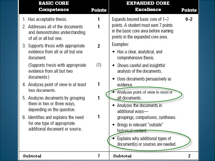 Rubric • You can score 9 points on the DBQ. • You can score 7 points on the Core. • In you earn all 7 points on the core, you might be able to earn 2 bonus points. • Don’t worry about the expanded core as it will be there if you follow the steps to writing the DBQ