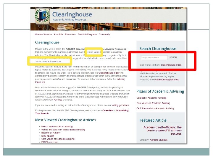 Clearinghouse Purpose / Content Promote the advancement of academic advising by providing members with electronic access to: Advising Issues & Resources Anchor/overview article Resource links to related Web sites and articles Pillar documents for academic advising links to recognized definitions, standards, and values of advising Member Produced Handbooks & Web Publications suggested by NACADA members as useful