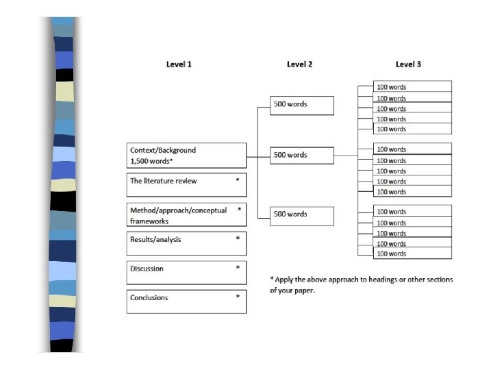 Level 3 outlining • You really decide on content. • Lets you check if it’s all needed. • Check that your sub-headings ‘add up to’ your headings and draft abstract. • Set word limits. • Write about content in sentences. • Revise as you go along.