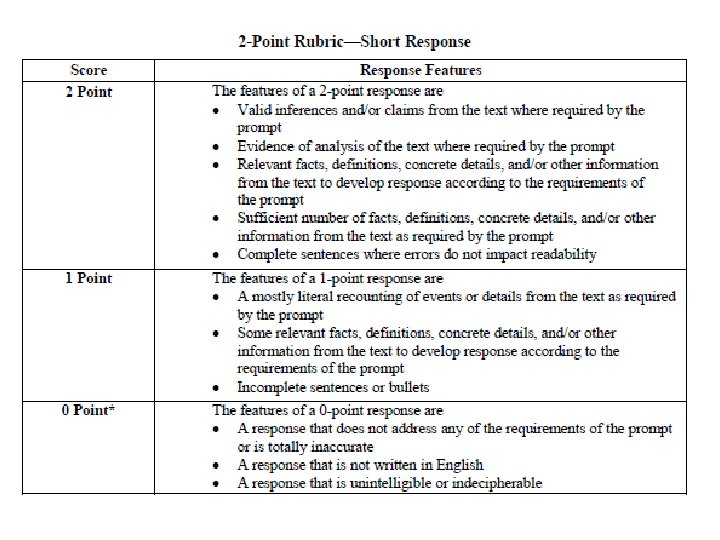 2 Point Response: • Complete sentences where errors do not impact readability (R) • Valid inferences and/or claims from the text where required by the prompt (A) • Relevant facts, definitions, concrete details, and/or other information from the text to develop response according to the requirements of the prompt (C) • Sufficient number of facts, definitions, concrete details, and/or other information from the text as required by the prompt (C) • Evidence of analysis of the text where required by the prompt (E)