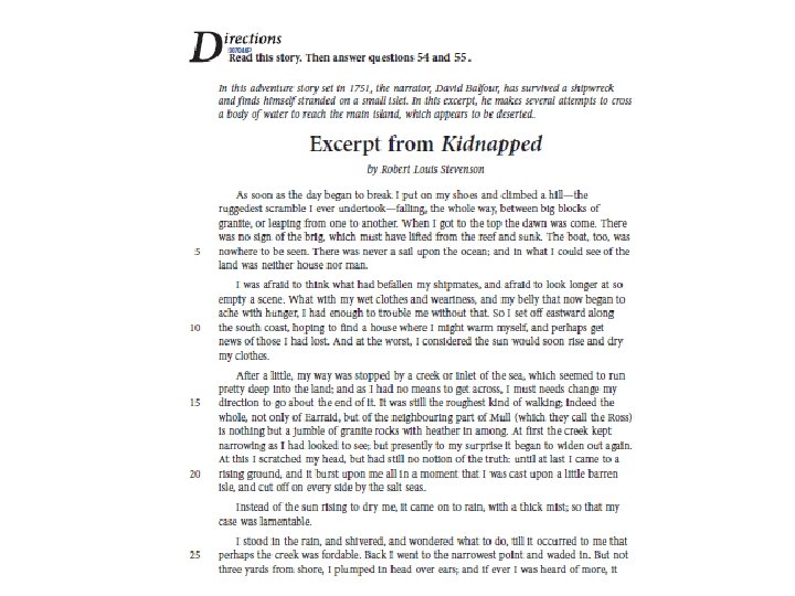 Now let’s take a look at our first question! Think back to our reading passage, Excerpt from Kidnapped. The following question is based on that reading.