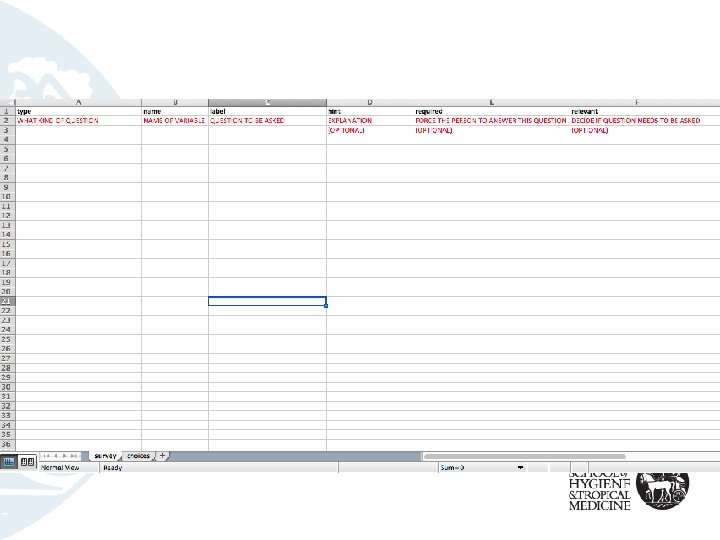 Survey Sheet • The top row needs three columns a minimum – Type (CELL A 1) – Name (CELL B 1) – Label (CELL C 1) • It may also need other columns – hint – required – relevant – constraint_message – (Others)