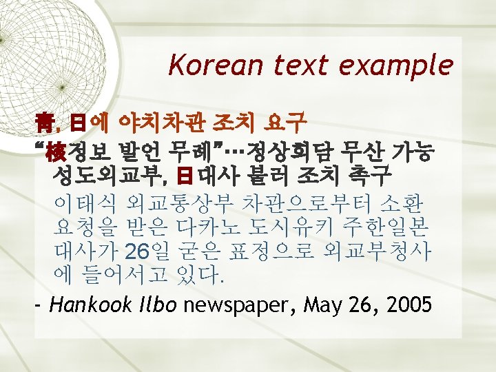Chinese characters in Korean Like Japanese, Korean has thousands of borrowed Chinese morphemes Historically, these words were written with Chinese characters; hangŭl was used for inflectional endings and native Korean words Over the last fifty years, the use of Chinese characters has declined considerably No longer used in North Korea Increasingly rare in South Korea