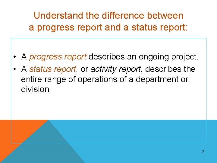 Understand the difference between a progress report and a status report: • A progress report describes an ongoing project. • A status report, or activity report, describes the entire range of operations of a department or division. 2