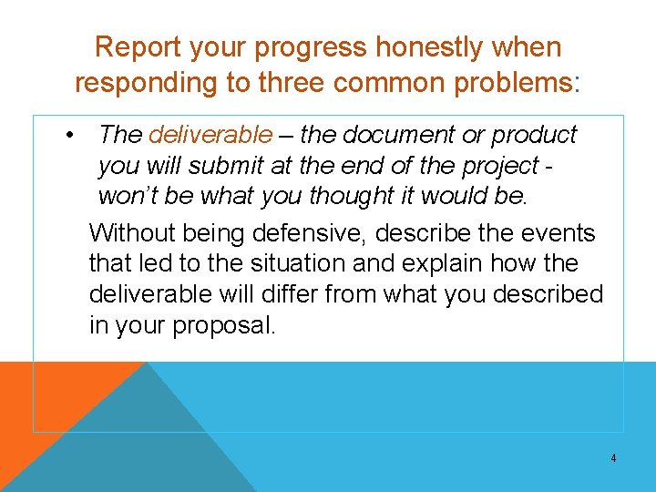 Report your progress honestly when responding to three common problems: • The deliverable – the document or product you will submit at the end of the project won’t be what you thought it would be. Without being defensive, describe the events that led to the situation and explain how the deliverable will differ from what you described in your proposal. 4