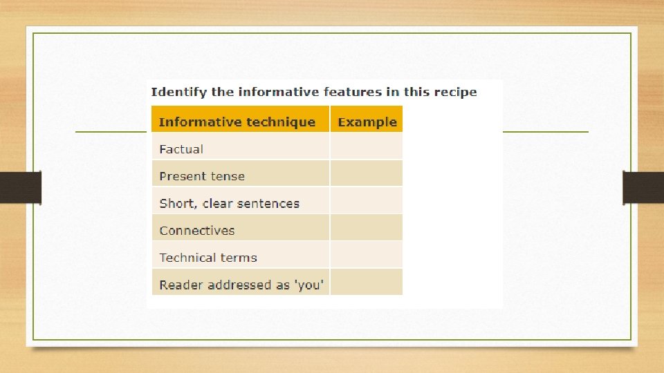 Useful Techniques • When writing to inform, make sure language is : • clear, factual and impersonal. • Use short and clear sentences. • Break up the writing with diagrams, illustrations, pictures and subheadings.