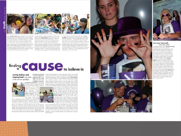 GO FORTH AND WRITE …yearbook copy that’s grammatically correct and well-thought out. Your third-person, past-tense stories should have specific angles that tie them to the school and the coverage year. The best of the best begin with enticing leads and are filled with great quotes from a variety of sources and specific details that add to the photos and captions to create the complete story of the year.