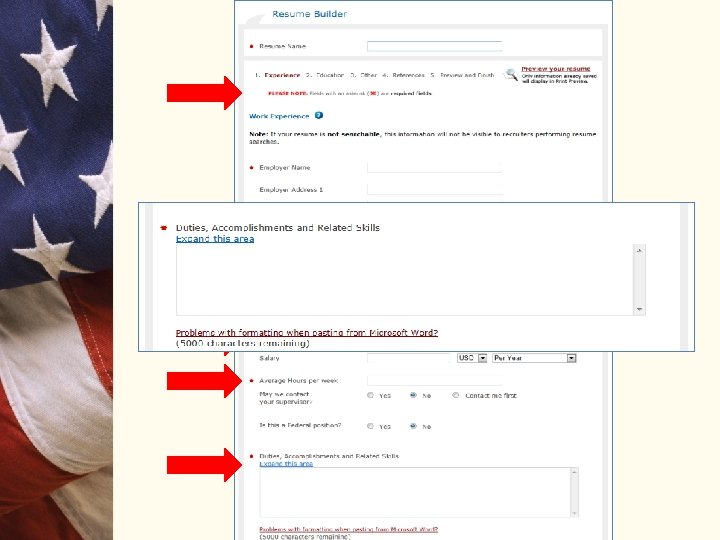 USAJOBS • Allows users 5 résumés – Upload – Build – Combination